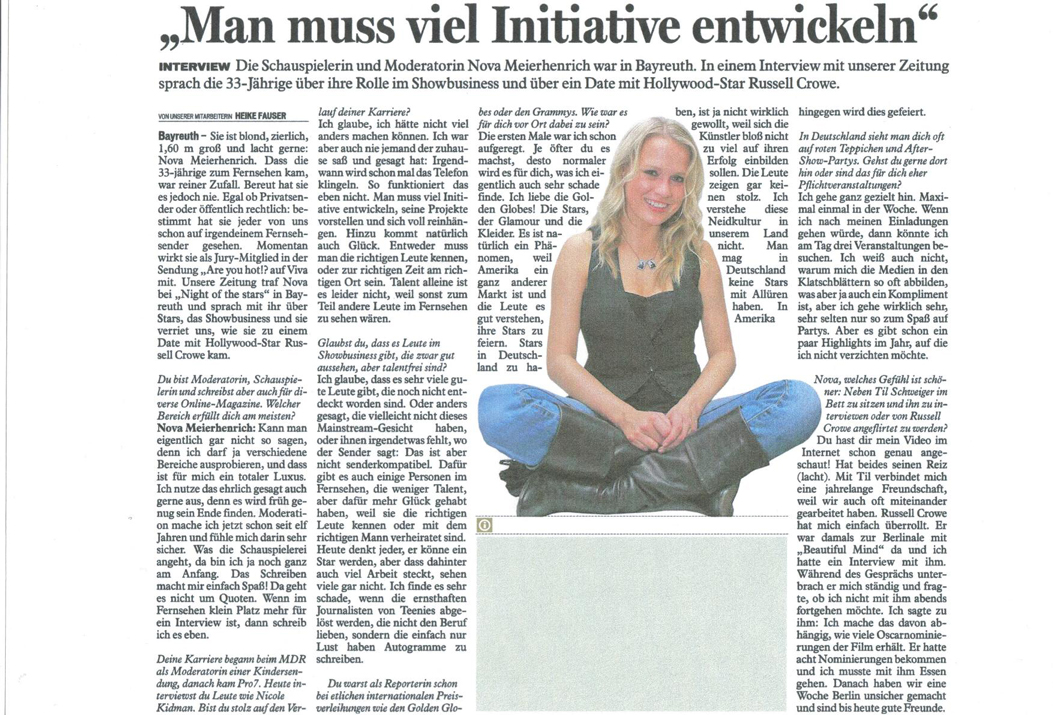 Interview: Die Schaupielerin und Moderatorin Nova Meierhenrich war in Bayreuth. In einem Interview mit unserer Zeitung sprach die 33-Jährige über ihre Rolle im Showbusiness und über ein Date mit Hollywood-Star Russell Crowe.