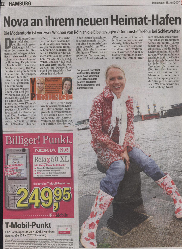 28. Juni 2007 MOPO – 28.6.2007 – "Nova an ihrem neuen Heimathafen" Die Moderatorin ist vor zwei Wochen von Köln an die Elbe gezogen / Gummistifel-Tour bei Schietwetter!